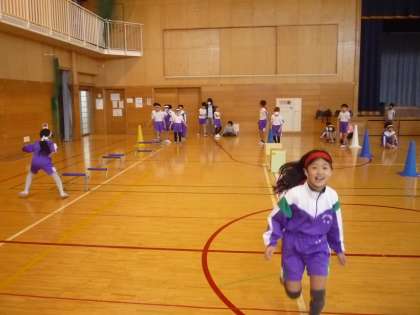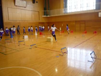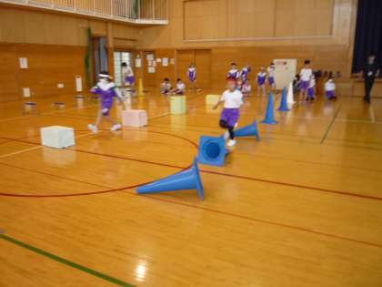障害走では、ミニハードルや箱を跳び越したり、カラーコーンをよけながらジグザグに走ったりしました。