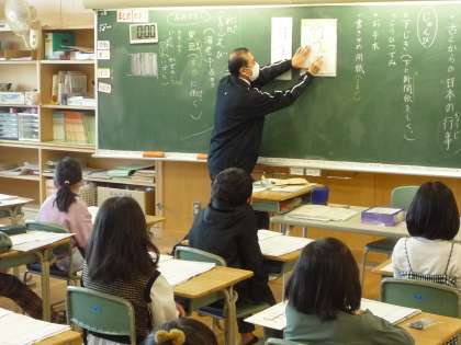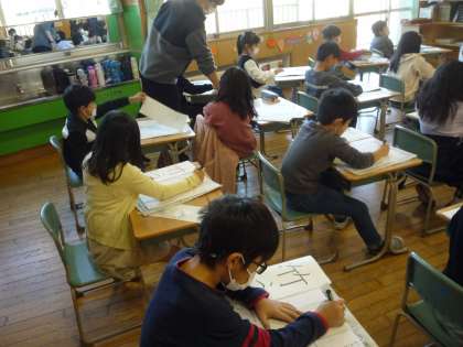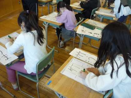 書き初めの練習をしました。書写専科の立石先生のお手本に思わず拍手が起こりました。立石先生のような字が書けるよう頑張っています。