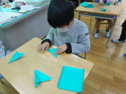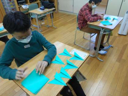 12月になり、そろそろクリスマスが近づいてきたので、クリスマスリースを作りました。同じ形のパーツを作り、順序よくつなげてできあがりです。工程が簡単なこともあり、先にできた子が他の子に教えてあげる姿が見られました。リースができたので、今度は飾り作りです。どんな飾りを付けるか楽しみです。