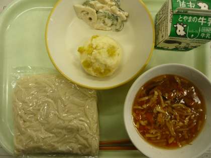 ソフト麺 五目あんかけ 蒸しパン れんこんのサラダ 牛乳