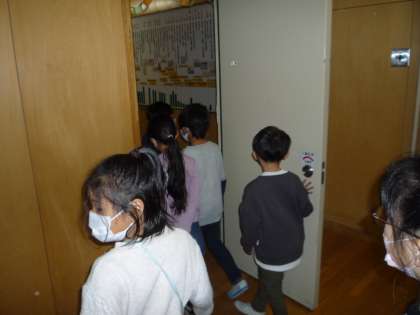 10日の避難訓練では、防火扉を自分で開けて避難する訓練を行います。初めての1年生は、防火扉についての説明と開け方を教えてもらいました。