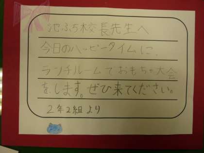 2年生から教職員に招待状が届きました。今日は教職員を招待してのおもちゃ大会です。