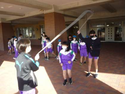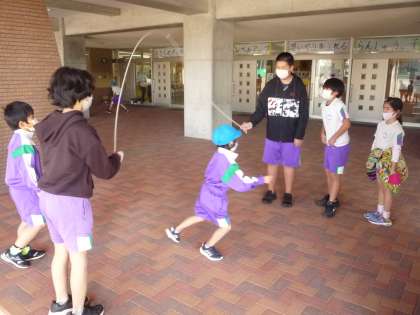 縦割り班での体力つくり活動に取り組んでいます。握力や反復横跳び等、体力テストの種目となが縄跳びに挑戦しました。