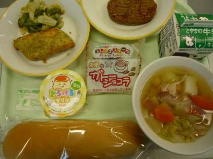 コッペパン 選択献立(魚の香草フリッター・照り焼きハンバーグ) アスパラサラダ ひよこ豆のスープ 選択デザート(ガトーショコラ・豆乳プリン)  牛乳