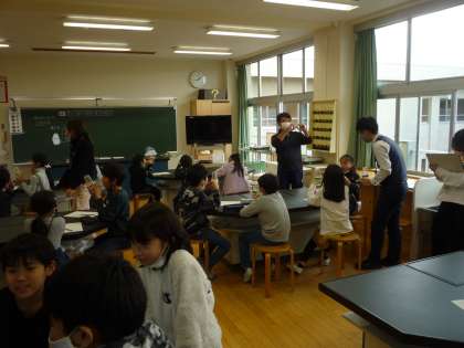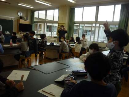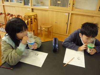 先生お手製の実験道具「フルエール」を使って、音の震えの学習を行いました。音の違いで砂の飛び跳ね方が違うことに驚いていました。