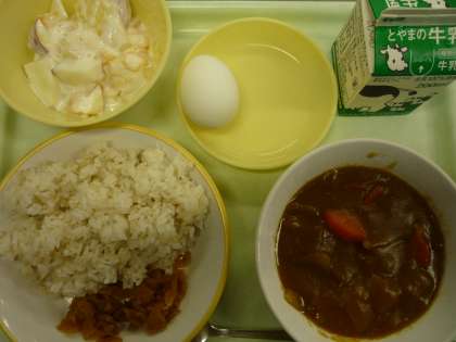 麦ごはん カレーライス 福神漬 ゆで卵 フルーツヨーグルト 牛乳
