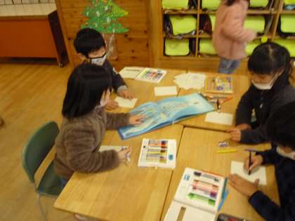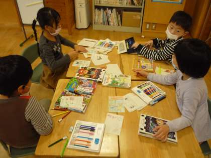 お店屋さんを開くための、品物をグループで考えたり、絵本を見ながら描いたりしました。どんな品物売ろうかとわくわくしながら描いています。