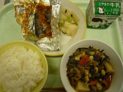 ごはん さばの銀紙焼き かぶの色どり 大豆の磯煮 牛乳