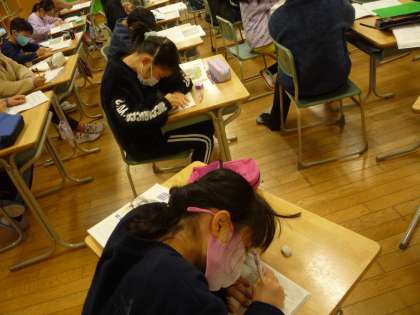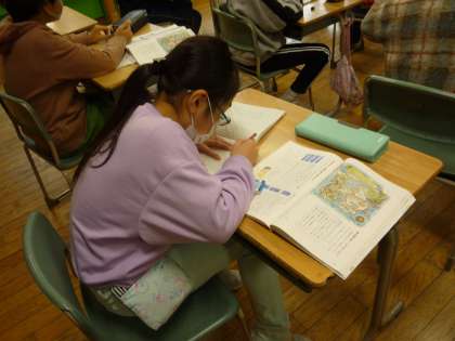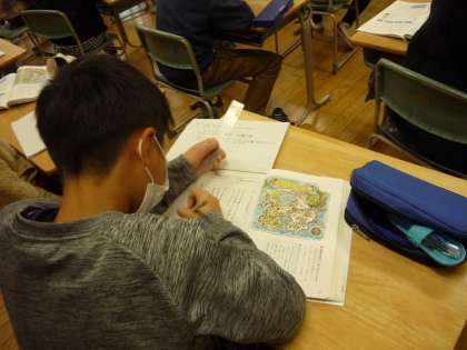「宝島のぼうけん」の学習で、1枚の地図からお話を作っています。