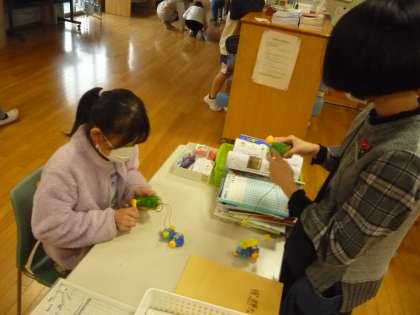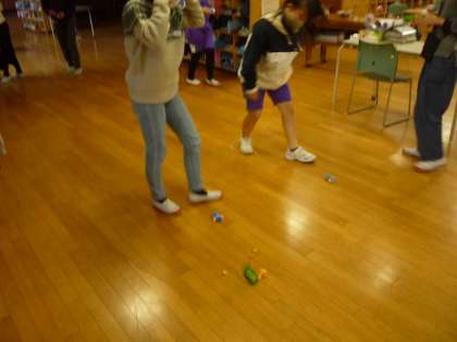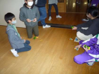 手動発電機で電気をためて、どれだけ動くかを競いました。