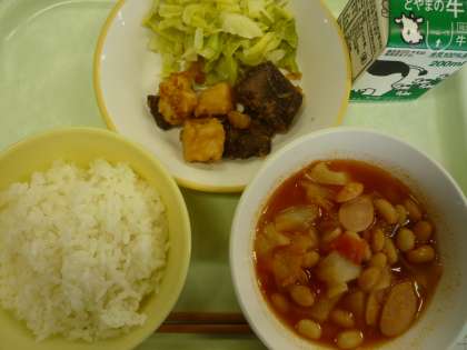 ごはん 鶏肉とレバーのねぎソース ゆでキャベツ 冬野菜のミネストローネ 牛乳