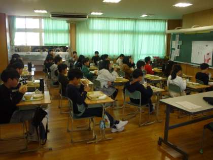 今日の読み聞かせタイムで、「ぶたのたね」を読んだのは、この先生でした。そのクラスの子供たちも給食を食べながら静かに聞いています。