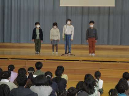 「がんばり発表」では、1年生と4年生の代表児童が、挨拶や掃除等、この2学期に頑張って取り組んだことを紹介しました。