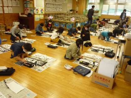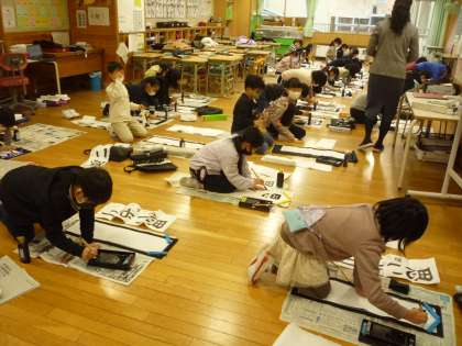 初めての毛筆での書き初め大会です。「思いやり」と書きました。冬休みの練習の成果が出ています。
