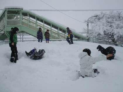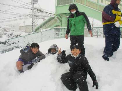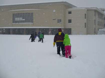 休み時間になると、真っ白なグラウンドに出て転げ回ったり、雪玉を投げたりして遊びました。