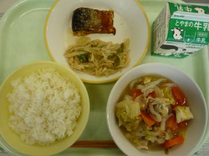 ごはん さばの照焼き はりはりソテー はくさいなべ 牛乳