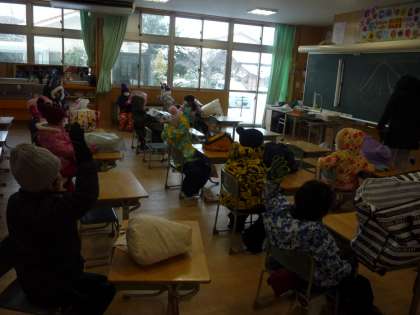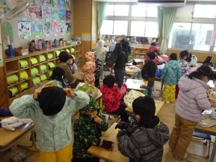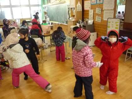 雪遊びのための準備です。今日はスキー山でそり遊びをします。とても楽しみにしているようです。