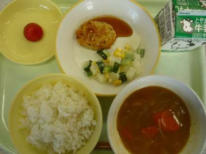 ごはん おばけのアッチ豆腐ハンバーグ サイコロサラダ のらねこスープ いちご 牛乳