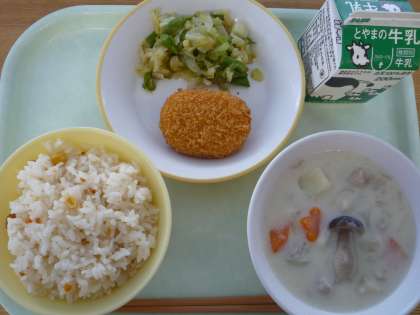 給食週間二日目の今日のお話は、「14ひきのシリーズ」です。14ひきのネズミの家族のお話で、読むとほっこりした気持ちになりますよ。はなやかえびピラフ、牛乳、かぼちゃコロッケ、アスパラサラダ、もりのあきまつりシチューです。