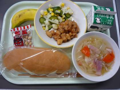 コッペパン 鶏肉のマーマレードソースがけ フレンチサラダ キャベツスープ バナナ 牛乳