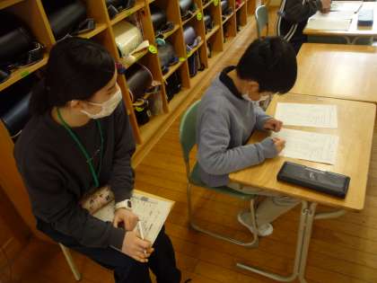 沸点の実験をしています。実験アシスタントの大学生も一緒に授業に参加しています。