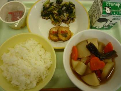 ごはん 野菜の肉巻き ゆかり和え おでん 納豆 牛乳