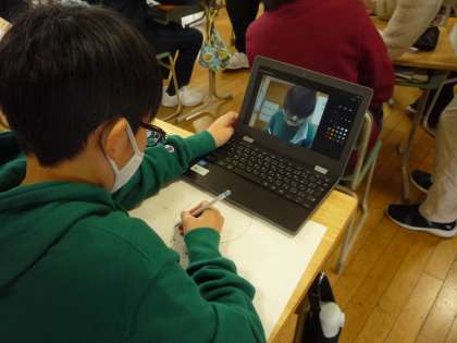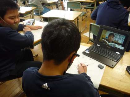 版画のための下絵を描いています。テーマは「○○をしているぼく・わたし」です。クロムブックで撮ってもらった画像を見ながら描いています。