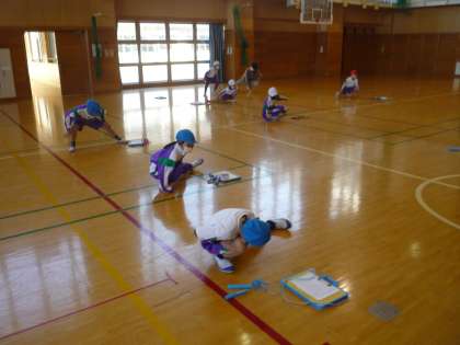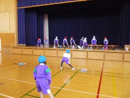 準備運動の係が前に出て、準備運動を進めています。