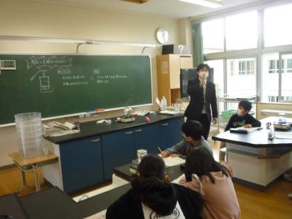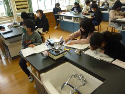 水蒸気の実験をしています。水が沸騰しているときの水蒸気の様子をよく観察しています。