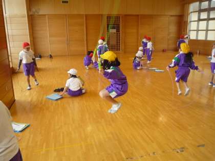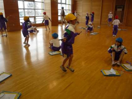 短縄跳びの練習では、いろいろな技に挑戦しています。
