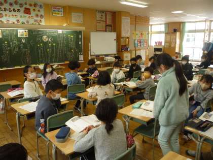 友達の考えに、体を向けてしっかり聞いています。