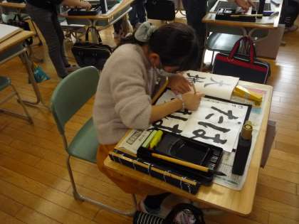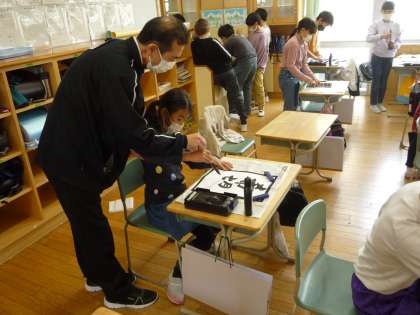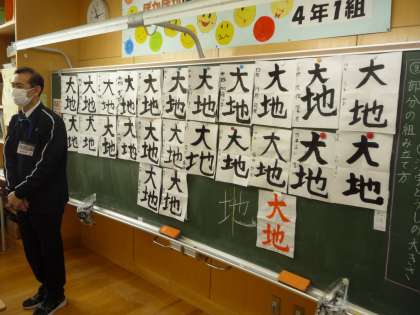 今日は書写最後の「大地」です。画数の少ない字とのバランスやへんとつくりの位置に気を付けて書きました。書き終わった児童は、卒業生へのメッセージにも挑戦しました。