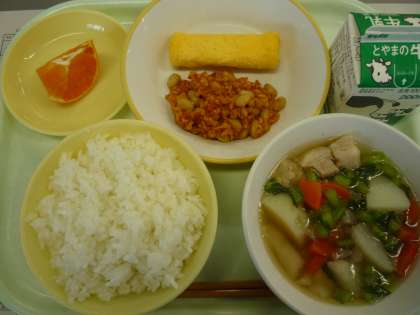 ごはん 卵ロール 白インゲン豆のトマト味 野菜スープ 甘平 牛乳