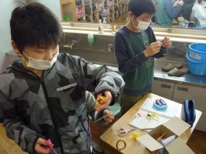 電磁石の実験キットの作成です。コイルを丁寧に巻いています。