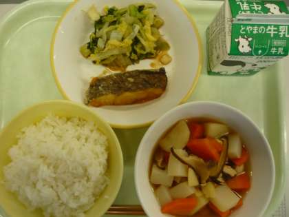 ごはん 揚げ魚のレモン味 はくさいひたし 大和煮 牛乳