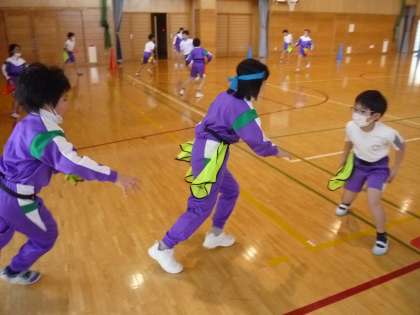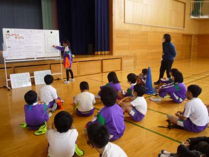 タグフットボールの学習では、グループで作戦を考えたり、作戦を成功させるために練習したりしています。また、ゲーム後には、振り返りを行い、作戦を改善したり、新たな作戦を考えたりして学習を進めています。