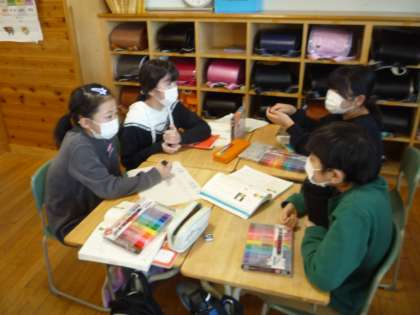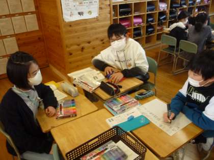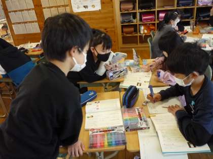 課題を見つけ、その解決策を提案するという学習では、テーマを「言葉」として、グループで課題や提案内容を話し合いました。