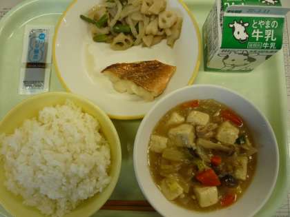 ごはん 赤魚の塩焼き れんこんのきんぴら 豆腐と野菜のうま煮 のり佃煮 牛乳