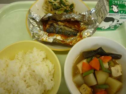 ごはん さばの銀紙焼き ごまびたし 関東だき 牛乳