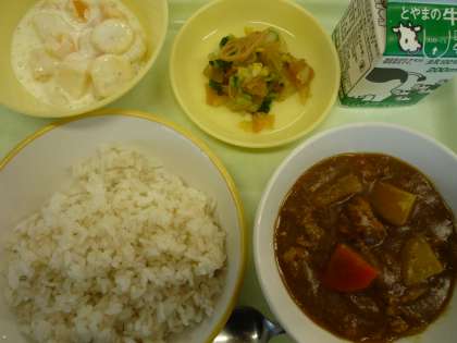 麦ごはん カレーライス 福神和え フルーツヨーグルト 牛乳