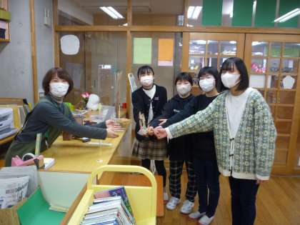 卒業生全員でデザインしたブックストッパーを司書の先生にお渡ししました。