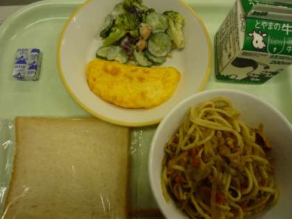 食パン 焼きそば オムレツ ビーンズサラダ ポケットチーズ 牛乳
