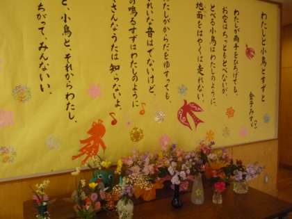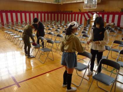 会場の体育館の準備も頑張っています。椅子をそろえたり、番号札を貼ったりと一生懸命です。地域の方に会場や教室に飾る花も生けていただきました。