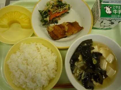 ごはん 魚のかば焼き はりはりあえ みそ汁 カットパイン 牛乳