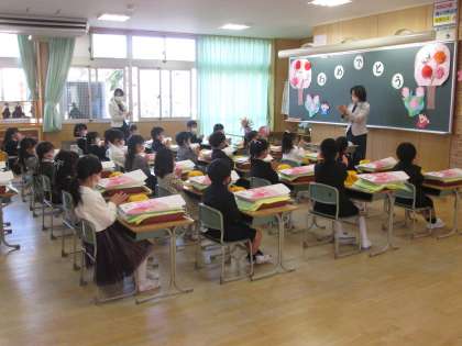 満開の桜の中、入学式を行いました。きらきらの笑顔がいっぱいでした。小学校に入学するのをみんなが待っていました。明日からも元気に登校しましょう。
