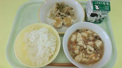 本日の給食は、ごはん、にんじんシューマイ、茎わかめのチョナムル、麻婆豆腐、牛乳 です。