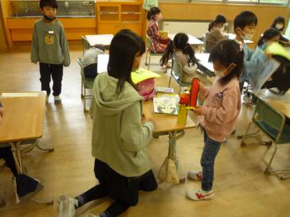 1年生へのお手伝いもだんだん慣れ、ゲームやクイズをしたり、冗談も言ったりして楽しませる余裕も出てきました。