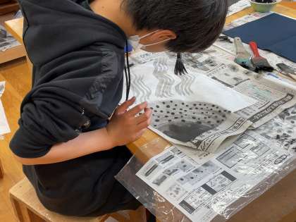 図画工作科では、墨と水だけをつかって作品をつくっています。「ぼかし」や「かすれ」など、様々な表現方法を使い、一つの墨からいろいろな「黒」が表現できるので、とても楽しんで作品づくりに取り組んでいます。