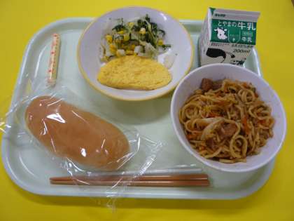本日の給食は、減量コッペパン、オムレツ、えごまドレッシングサラダ、焼きそば、棒チーズ、牛乳 です。