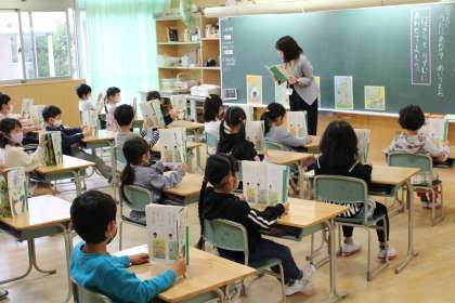 入学して初めての学習参観。1限は、3クラスとも国語科でした。緊張していましたが、みんな大きな声で「あいうえお」のうたを発表しました。